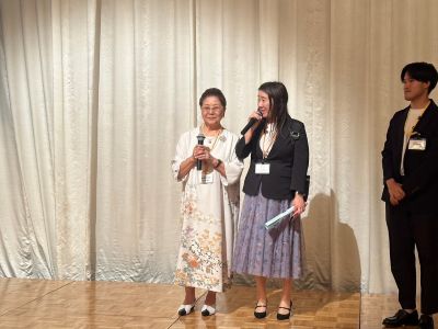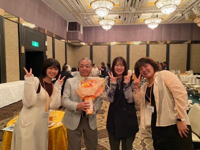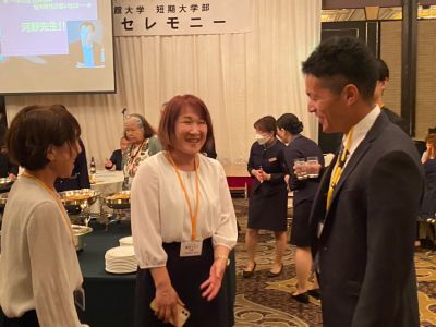 またサプライズとして、米寿を迎えられた五十川隆夫名誉教授と、古希を迎えられた谷岡郁子学長へ、同窓会を代表する卒業生から花束と記念品を贈呈。さらに、2024年パラリンピックに陸上競技トレーナーとして帯同する東千夏教員へも激励の花束が贈られました。