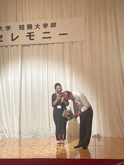 セレモニーの最後には、短大部長を務めあげた氏原隆先生へ、谷岡学長から感謝の花束が手渡され、温かな拍手に包まれました。