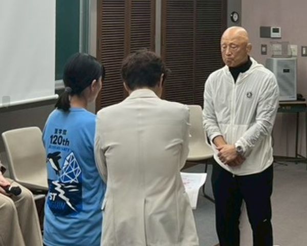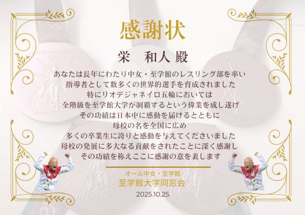 同窓会からは、栄氏の功績をたたえ感謝状と記念品を贈呈しました。栄氏からは「つらいことも楽しいこともありましたが、監督として悔いのない30年でした。モンゴル総監督と並行して、できる限り至学館のサポートにも携わっていきたい」と挨拶があり、大きな拍手に包まれました。