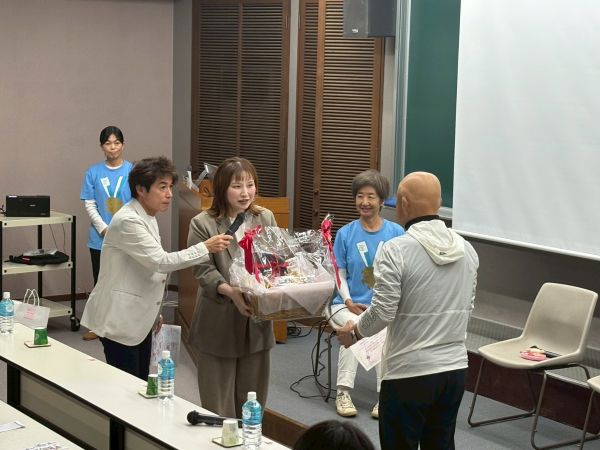冒頭にこれまでの栄氏の功績をVTRで紹介した後、和気あいあいとした雰囲気でトークショーがスタートしました。当時、栄監督の自宅に下宿していた選手たちの裏話や、土性氏の“今だから話せる栄監督の素顔”などが披露され、対談は終始笑顔あふれる展開に。他にも、「吉田沙保里選手がお菓子ばかり食べている」と聞きつけた栄監督が吉田選手の部屋を抜き打ち検査すると、ベッドの下からダンボール一杯のお菓子が見つかり、お菓子禁止令が出たというエピソードに会場からは大きな笑いが起こりました。また、学長からの「寮の食事での栄養サポートや地域の方々の差し入れといったご支援など、たくさんの方からの応援が輝かしい功績の原動力です」とのお話しに、多くの方が深くうなずく場面も。お楽しみ抽選会も盛り上がりました!