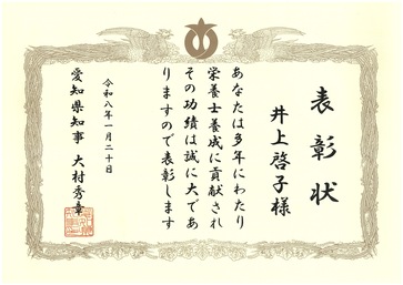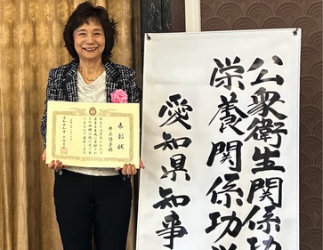 その中で"栄養士養成功労者"として、本学の井上啓子学科長が知事表彰を受けました。長年にわたる栄養士養成の功績や臨床栄養分野に関する研究業績、地域社会活動等が評価され、受賞にいたりました。