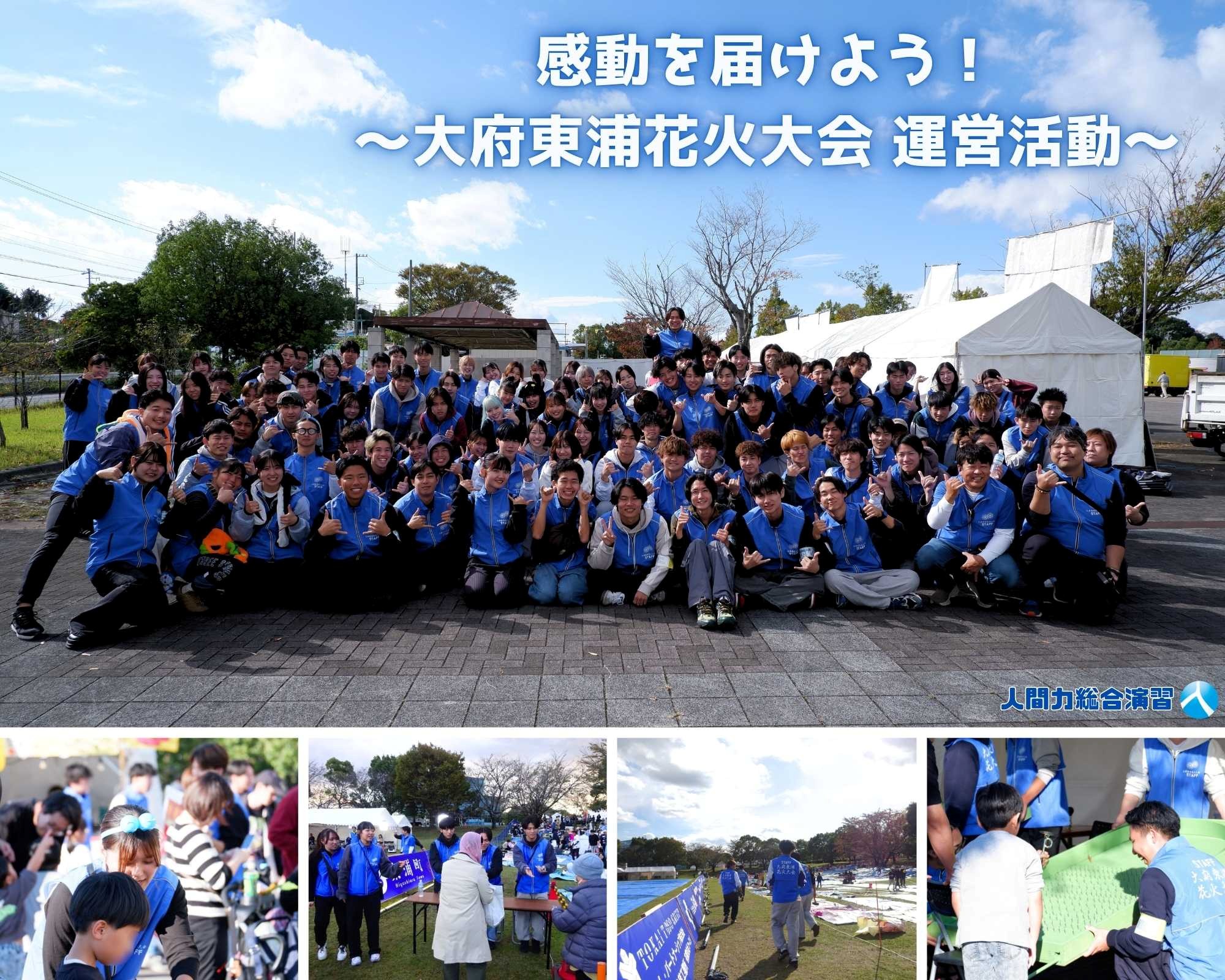 11月1日(土)、あいち健康の森公園(大府市)で「第9回大府東浦花火大会」が開催され、「人間力総合演習」の活動で、計107名の学生が運営スタッフとして参加しました。全体リーダーは、辻蒼葉さん(健康スポーツ科学科4年)が務め、辻さんを含めた13名の学生は、子ども向けブースの企画及び立案、準備等で4月から半年にわたり携わりました。 学生は、各々の目標を設定し、地域の方々や学生同士で深く関わり、「人間力」の向上に努めました。