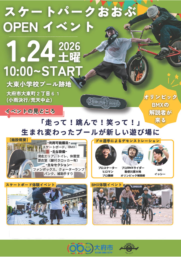 大府市大東町にある大東小学校のプール跡地に「スケートパークおおぶ」がオープンします。