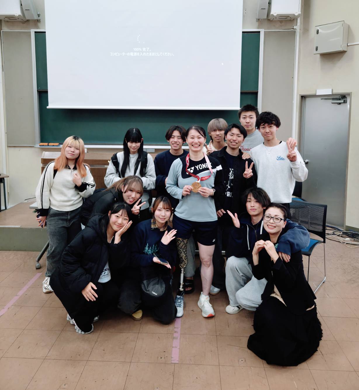 11月24日(月振)の「現代人間論〈人間図鑑〉」(担当:越智久美子准教授)のゲスト講師に『東京2020パラリンピック競技大会』バドミントンの女子ダブルスで銅メダルを獲得した伊藤 則子さんをお招きしました。講義では、伊藤さんのライフヒストリーとともに障がい者スポーツの魅力を話していただきました。さらに、日常生活の義足と競技用の義足をどのように履き替えるかも見させていただきました。