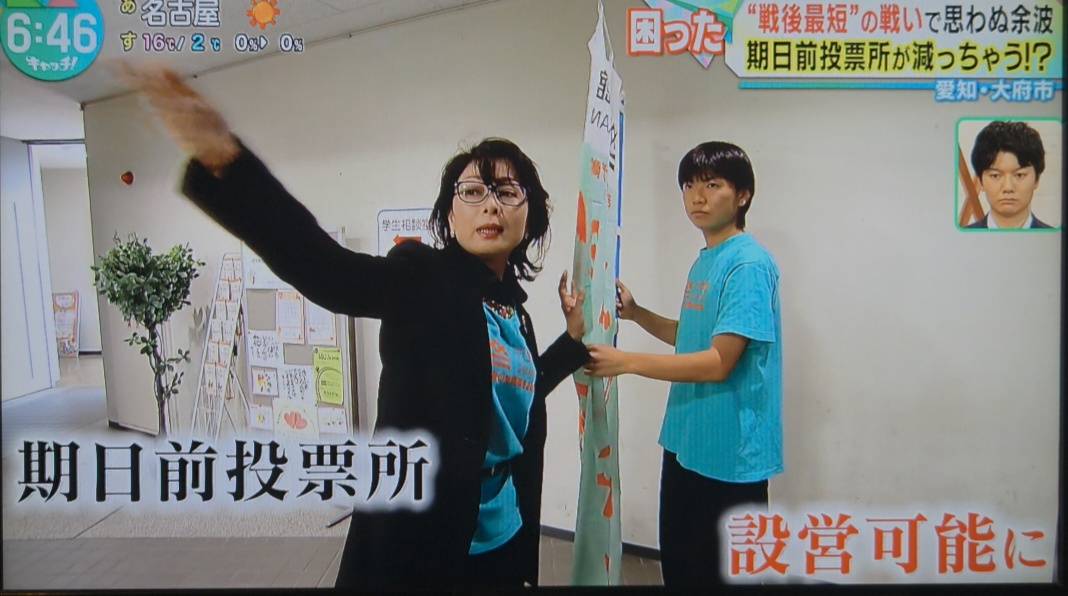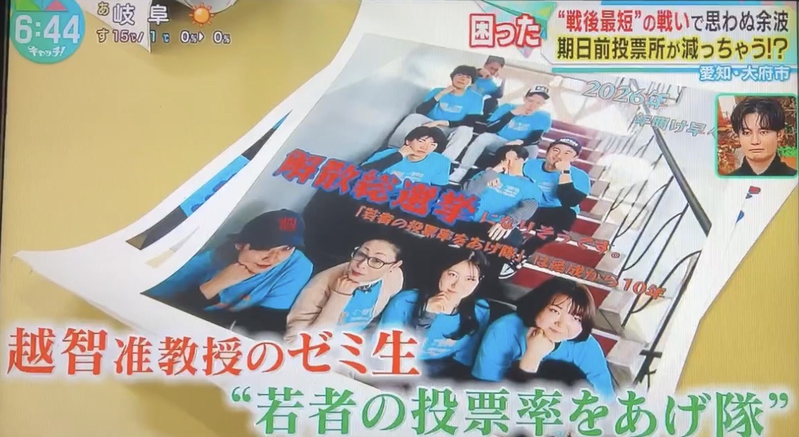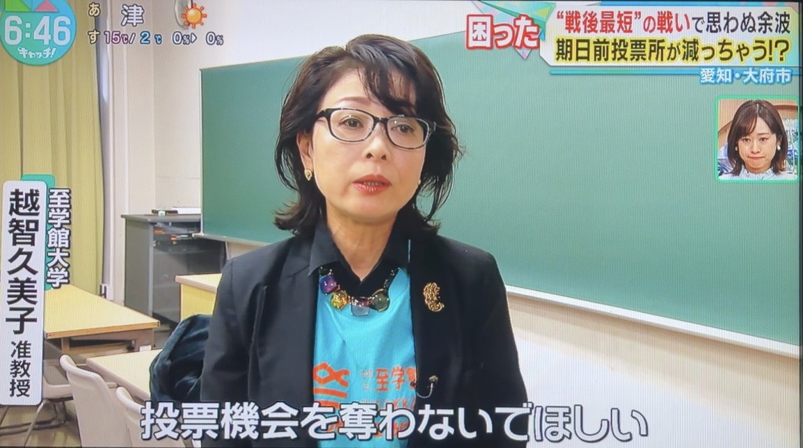 衆議院の解散・総選挙をめぐり、早ければ2月8日投開票の「超短期決戦」となる見込みから、様々な準備が間に合わず、期日前投票所の設置が減少するかもしれない状況の中、至学館大学内での期日前投票所の開設に係る「若者の投票率をあげ隊」(越智久美子准教授のゼミ生)の活動が1月16日(金)に中京テレビ「キャッチ」で放送されました。