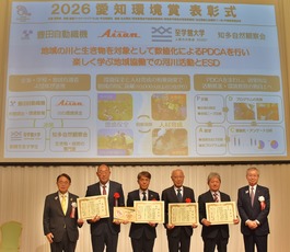 2月17日(火)、ホテルメルパルク名古屋で「2026愛知環境賞」の表彰式が執り行われ、本学からは竹下俊一副学長が代表として出席し、大村秀章愛知県知事より表彰状と盾を授与されました。 式典には実際の活動を行ってきた佐藤(桂)ゼミの3年生も参加し、今後のさらなる活動推進に向けて意欲を燃やしていました。 なお、活動内容を示したパネルは1000号館2階の廊下に、盾は学歓ホールに展示される予定です。